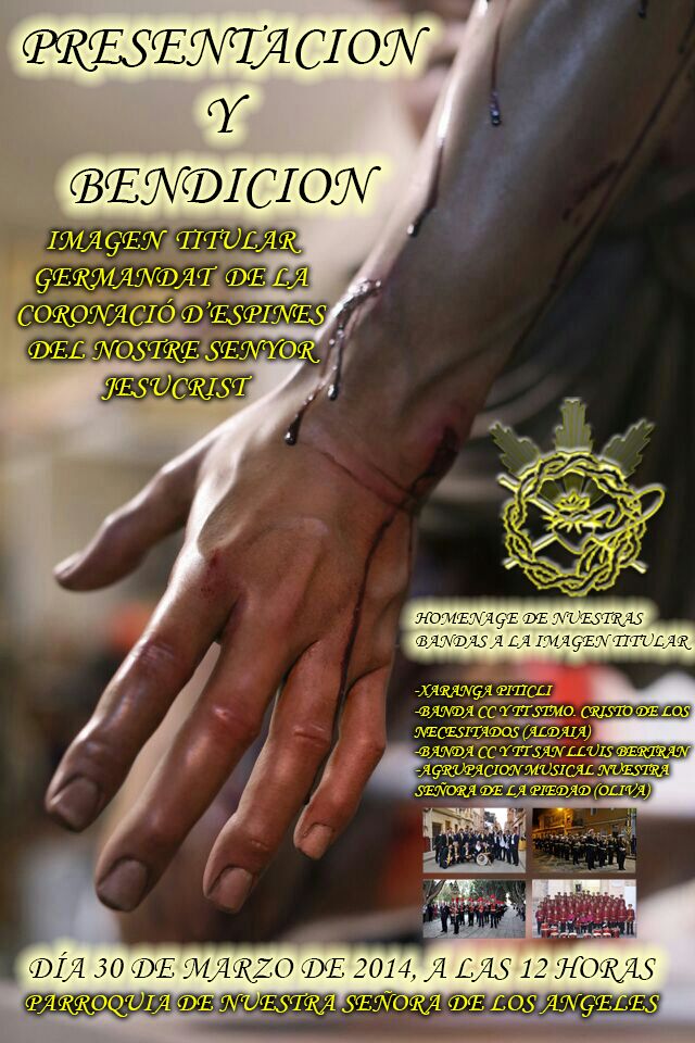 Sin duda será uno de los días mas importante e inolvidable para todos nosotros, arropados por nuestro amigos y familiares, por lo que desde estas líneas os invitamos a compartir con nosotros este día tan especial, en el que después de la Eucaristía, Presentación y Bendición de nuestro Paso Procesional dentro del Templo, a la salida en la plaza, nuestras estimadas bandas de música como son La Agrupación Musical de Cornetas y Tambores de la Piedad de Oliva, La Banda de Cornetas y Tambores de San Luis Beltrán, La Banda de Cornetas y Tambores de los Necesitados de Aldaia, y la Xaranga Piticli, rendirán homenaje a nuestra Imagen Titular, deleitándonos con sus marchas procesionales.
