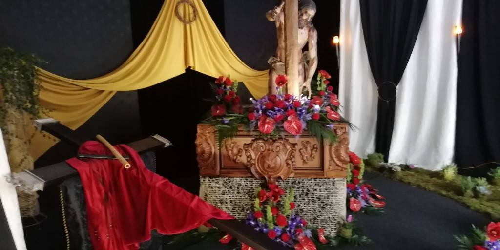 Todos los años después del Traslado de Imágenes el domingo de Ramos, nuestra imagen titular es llevada a la casa agraciada. Desde su realización tenemos la gran suerte de contar con la amabilidad de D.José , Director del Colegio Chiner de Villarroya que año tras año nos deja sus instalaciones para poder realizar el dossel del Cristo durante la semana santa.